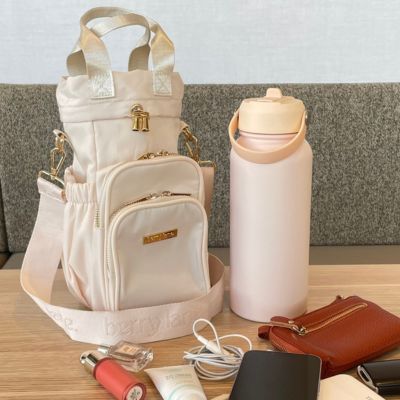 Fits my large 1.8 litre bottle. Took it on my trip to London and it was the perfect day bag. Fits everything I needed without the bulkiness like a tote, has room for my iPhone 16 pro max, wallet, passport, drink, lip balm, hand cream and nasal spray plus room to spare. I get asked about it by others. I’m def getting one for my best friend.